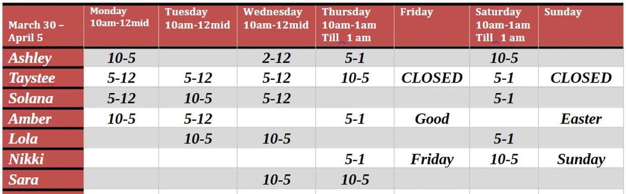 OPEN: Mon-Wed - 10am-12mid Thurs - Sat - 10am-1am